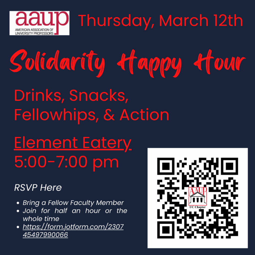 While it is frightening how widely and quickly these attacks are occurring, it is unconscionable that University of Cincinnati Leadership is anticipatorily surrendering to them. There is still time to reach an agreement that protects, at least for the next three years, several fundamental rights of faculty at UC. With the filing of the Unfair Labor Practice charge, we are urging University Leadership to reconsider its decision. The AAUP-UC Chapter—at the bargaining table, at the State Employment Relations Board, on our campus, in our cities, and in our State—will continue to vigorously and loudly oppose these attacks.